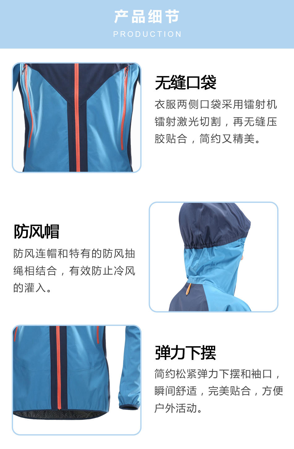 • 彈力下擺:簡(jiǎn)約松緊彈力下擺和袖口,瞬間舒適,完美貼合,方便戶外活動(dòng)。