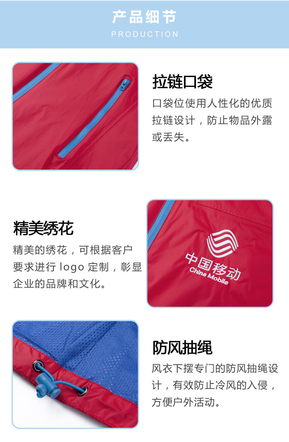 精美繡花:精美的繡花,可根據(jù)客戶要求單層風(fēng)衣定制的logo設(shè)計(jì),彰顯企業(yè)的品牌和文化。