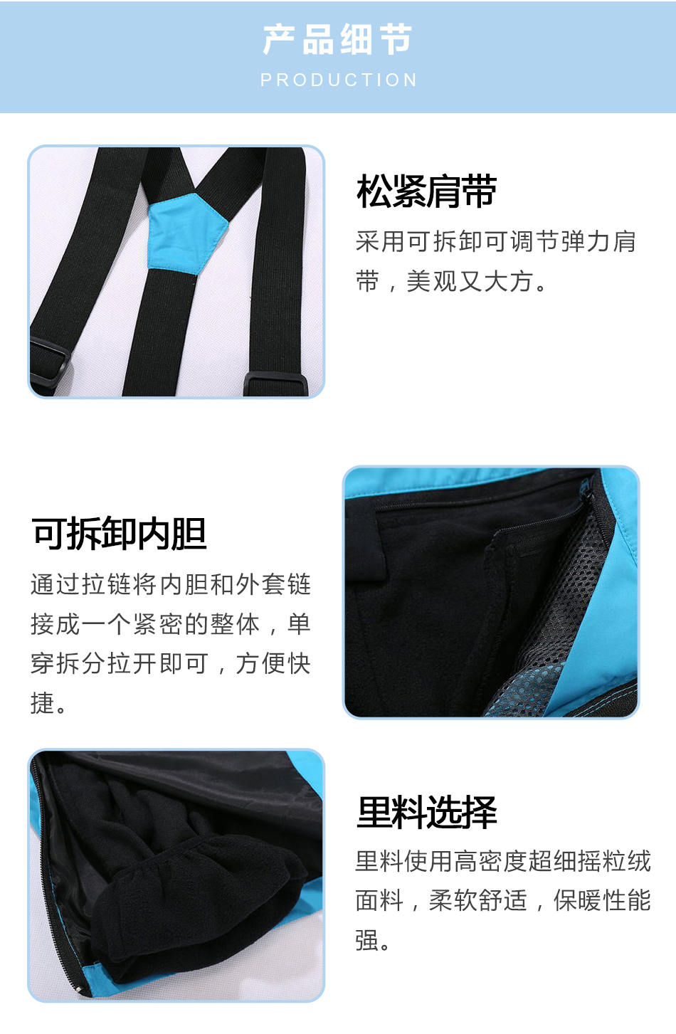• 可拆卸內膽:通過拉鏈將內膽和外套鏈接成一個緊密的整體,單穿拆分拉開即可,方便快捷,專業滑雪服定制