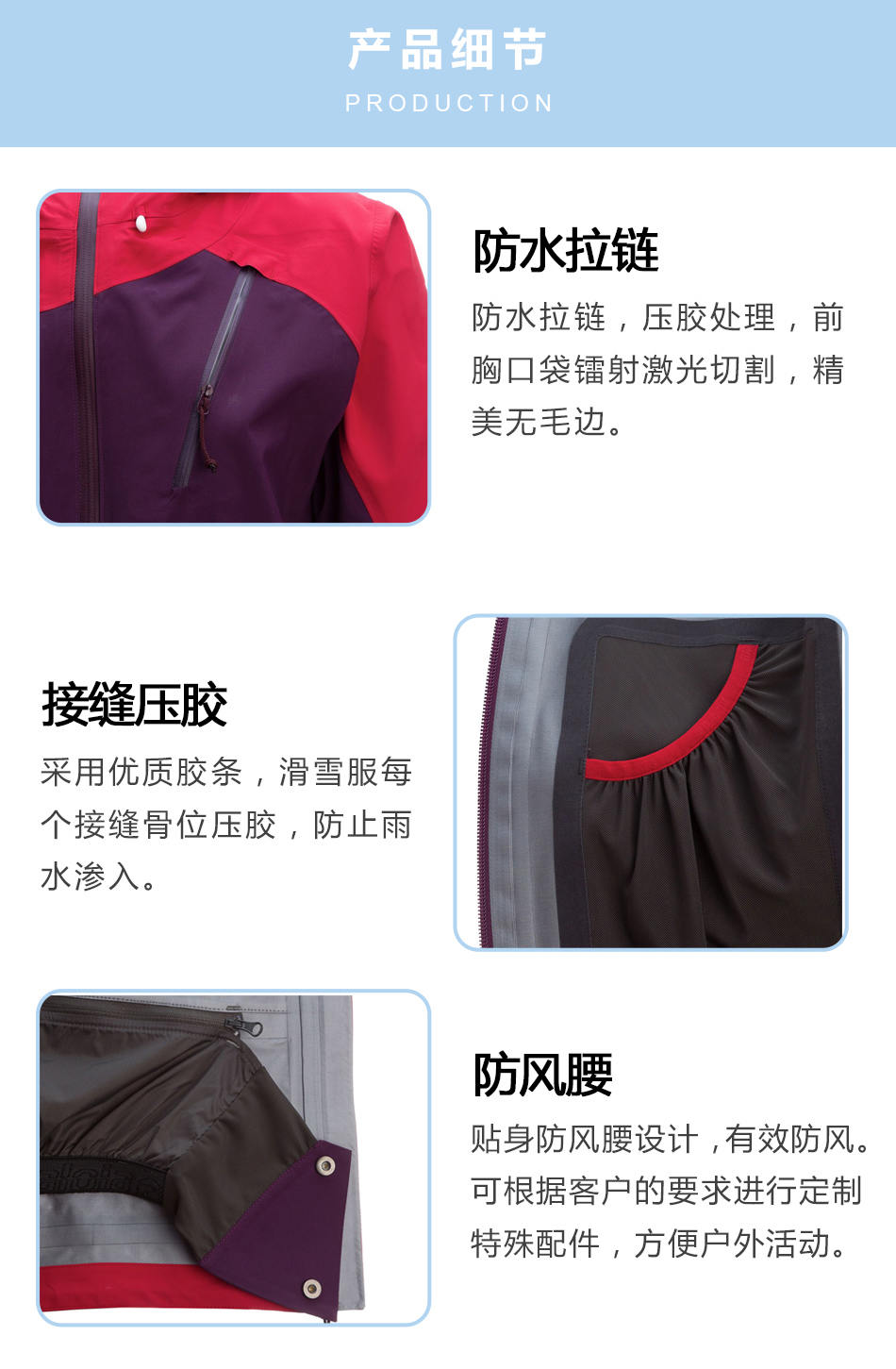 接縫壓膠:壓膠滑雪服生產(chǎn)采用優(yōu)質(zhì)膠條,滑雪服每個接縫骨位壓膠,防止雨水滲入。